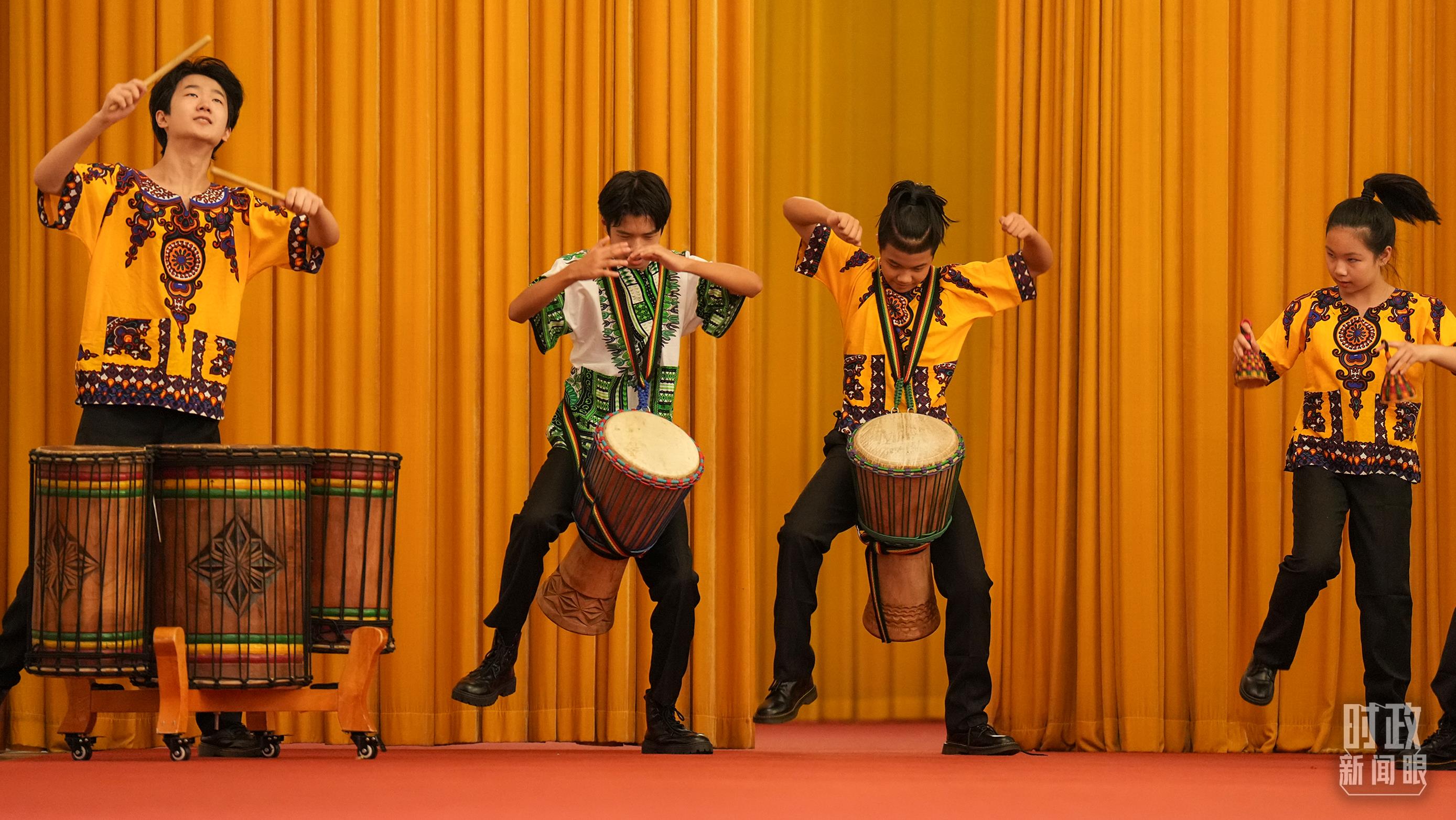 中國(guó)少年打起歡快的非洲鼓。(總臺(tái)記者李晉拍攝)