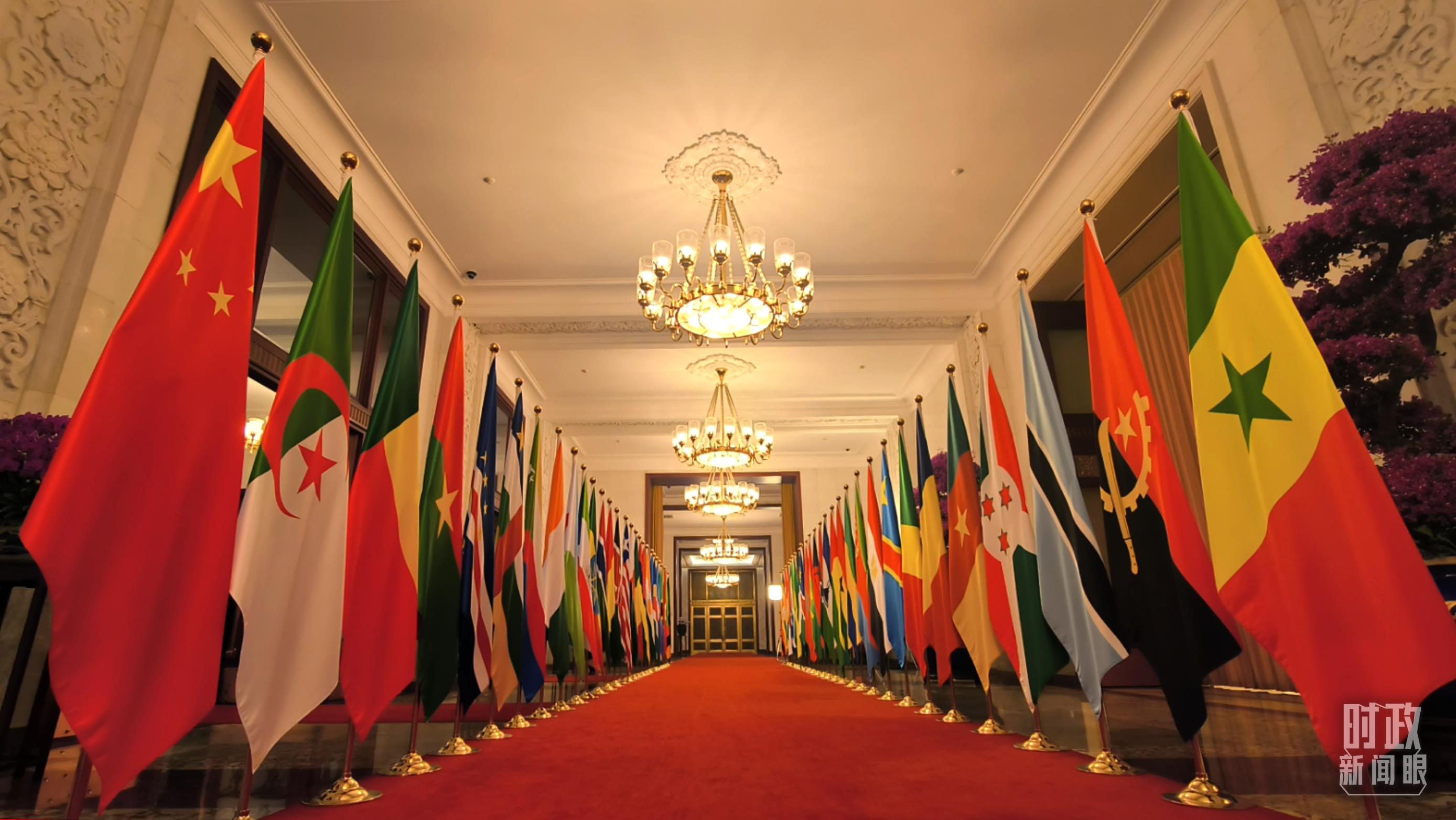 人民大會(huì)堂北大廳,中國(guó)國(guó)旗和中非合作論壇成員國(guó)國(guó)旗以及非洲聯(lián)盟旗幟交相輝映,巨幅蘇繡壁畫《長(zhǎng)城》氣勢(shì)恢宏。