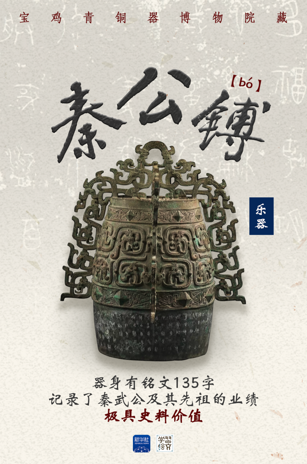這件秦公镈是大型打擊樂(lè)器,器身有135字銘文,記述了秦襄公被周平王“賞宅受?chē)?guó)”的歷史,以及文公、靜公、憲公三代治國(guó)興邦的業(yè)績(jī),是研究秦國(guó)早期歷史的重要實(shí)物資料。
