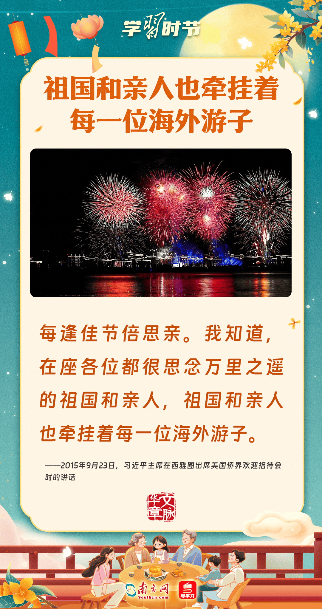 明月寄相思,家國總關(guān)情。作為中華優(yōu)秀傳統(tǒng)文化的重要載體之一,中秋節(jié)不但寄托著海內(nèi)外華人對闔家團圓的美好期許,還承載著深厚的故鄉(xiāng)情、家國情。習(xí)近平總書記曾在多個場合深刻闡述個人、家庭與國家之間的關(guān)系,強調(diào)要厚植家國情懷,把實現(xiàn)個人夢、家庭夢融入國家夢、民族夢之中。中秋佳節(jié),讓我們一起回顧總書記那些經(jīng)典話語,共同感受他至深至厚的家國情懷。