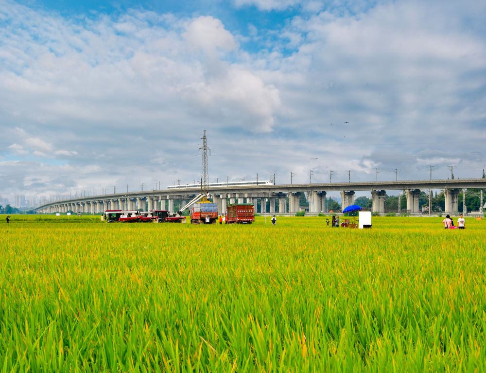 2023年8月28日,收割機在永豐村高標準農田內收割水稻。十多年來,科研團隊從500余個省內外優(yōu)良品種中篩選出29個適合當地種植的高產、優(yōu)質、宜機化品種在眉山當地大面積應用。