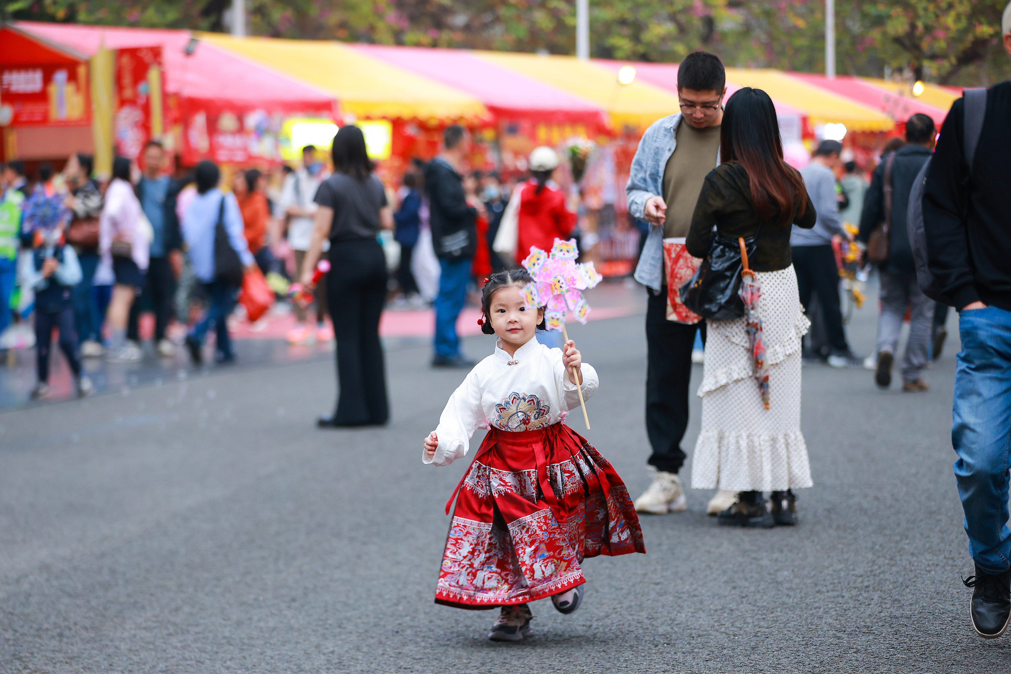 拿著風(fēng)車穿著馬面裙的小女孩在廣州的花市上開(kāi)心奔跑。