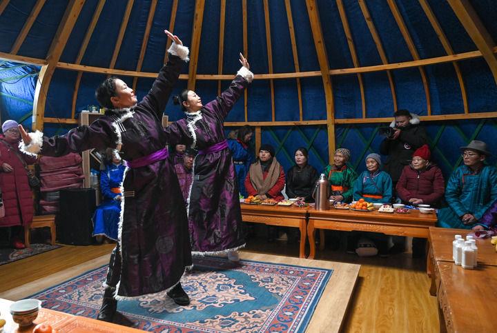 2023年12月21日,烏蘭牧騎隊員在內蒙古阿其圖烏拉蘇木進行舞蹈表演。