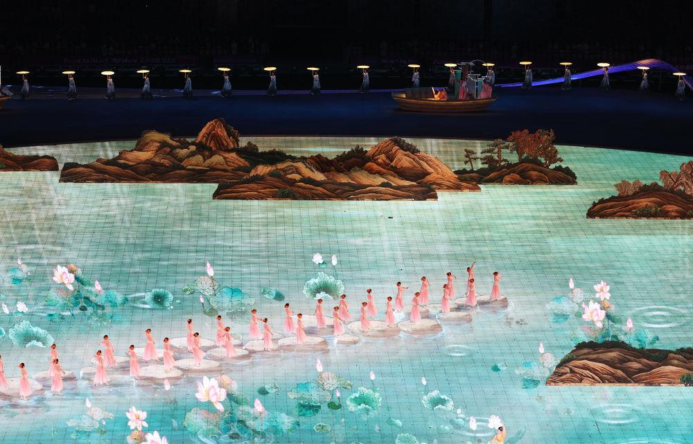 2023年9月23日,演員在杭州亞運會開幕式上表演?!肚Ю锝綀D》和《富春山居圖》兩幅國寶級名畫,通過數(shù)字技術,成為移動的山水。