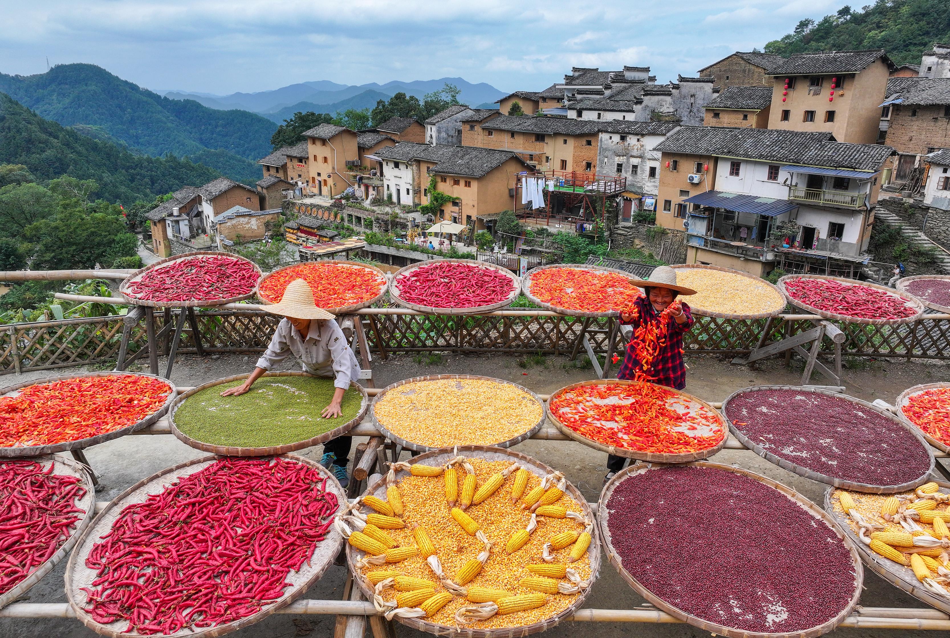 2024年9月22日,安徽省黃山市歙縣陽產村,村民正在土樓前晾曬農作物。