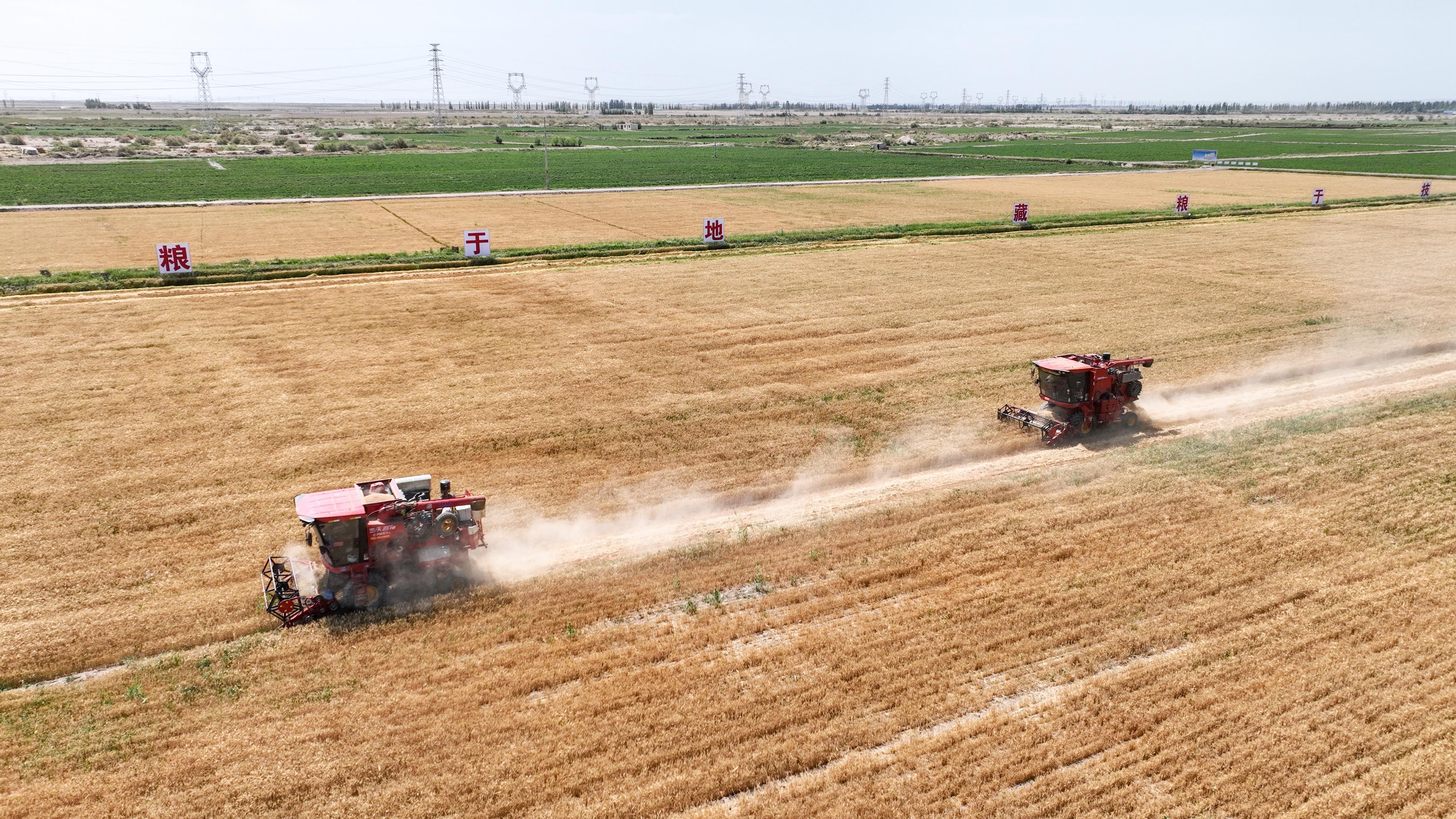 2024年7月10日,在甘肅省酒泉市金塔縣東壩鎮(zhèn)小河口村中度鹽堿耕地綜合治理利用示范點,1000余畝鹽堿地小麥喜獲豐收。