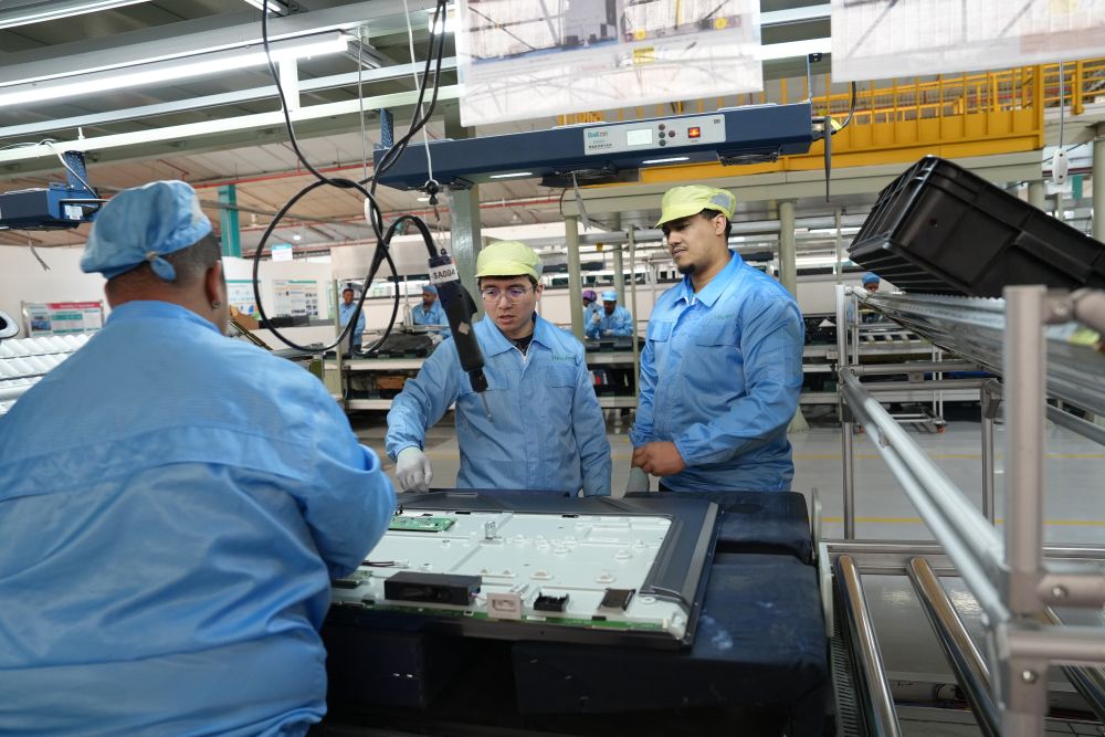 2024年8月14日,中方工程師(中)在南非開普敦的海信南非工業(yè)園電視機生產(chǎn)線上指導(dǎo)當(dāng)?shù)貑T工工作。工業(yè)園已為當(dāng)?shù)貏?chuàng)造1000多個直接就業(yè)機會、5000多個間接就業(yè)崗位,帶動地區(qū)產(chǎn)業(yè)鏈發(fā)展。