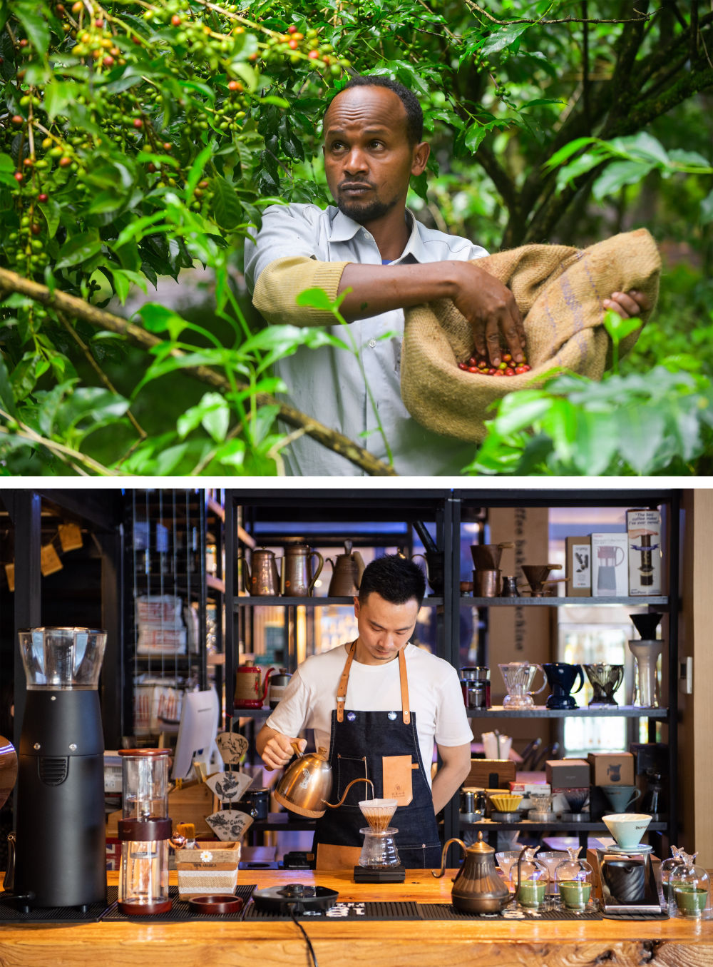 上圖:2021年9月22日,在埃塞俄比亞奧羅米亞州戈馬地區(qū)的一個咖啡園,農(nóng)民胡森·穆罕默德在采摘咖啡豆;下圖:2021年9月24日,在湖南省長沙市高橋大市場非洲咖啡街一家咖啡館,咖啡師彭杰在制作咖啡飲品。隨著中國開放的大門越開越大、中國咖啡消費的快速增長,埃塞俄比亞咖啡在中國越來越受歡迎。