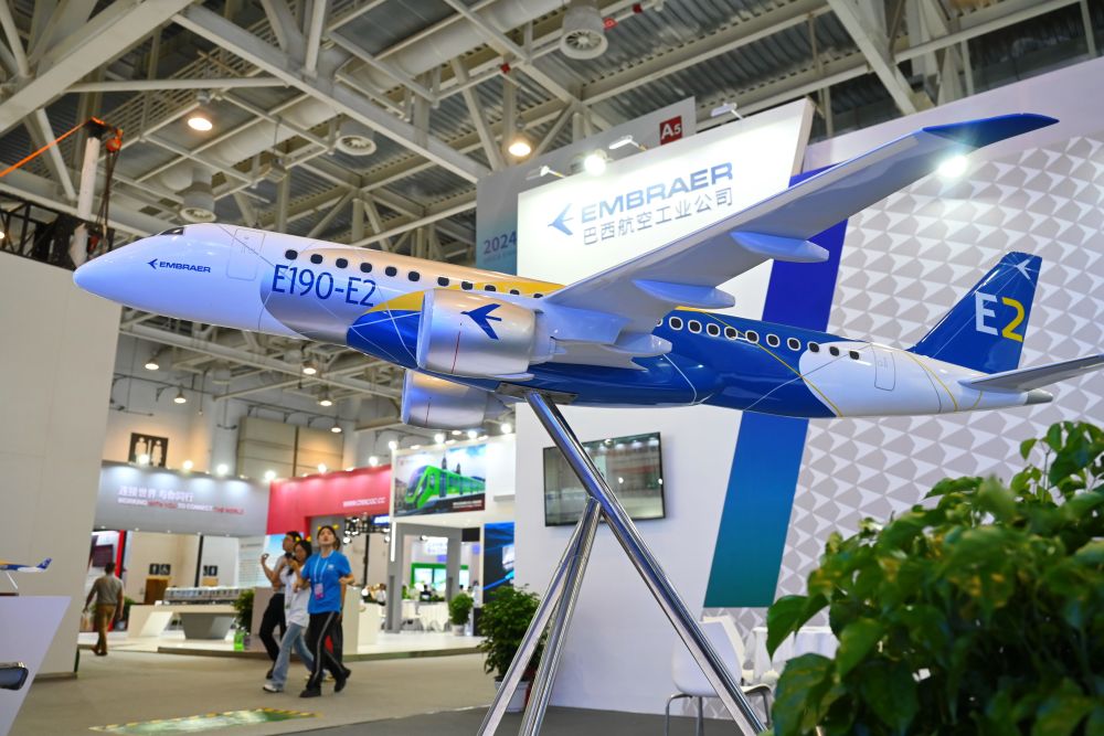 這是在廈門(mén)舉行的2024金磚國(guó)家新工業(yè)革命展巴西展位展出的E190-E2飛機(jī)模型。新華社記者林善傳攝