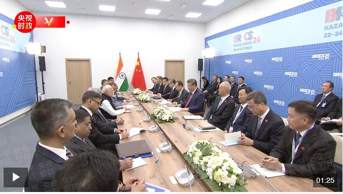 當(dāng)?shù)貢r間10月23日,國家主席習(xí)近平在喀山出席金磚國家領(lǐng)導(dǎo)人會晤期間會見印度總理莫迪。
