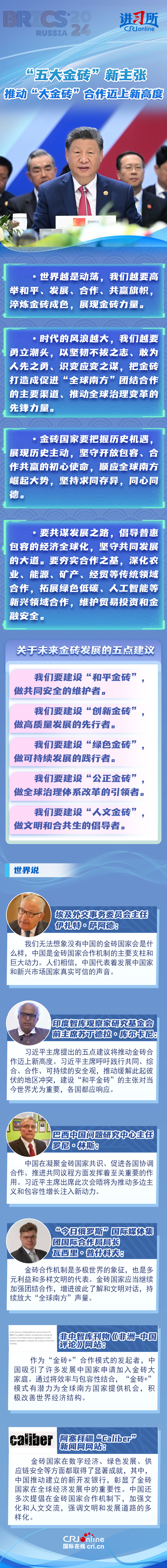 “時代的風(fēng)浪越大,我們越要勇立潮頭,以堅韌不拔之志、敢為人先之勇、識變應(yīng)變之謀,把金磚打造成促進(jìn)‘全球南方’團(tuán)結(jié)合作的主要渠道、推動全球治理變革的先鋒力量?!碑?dāng)?shù)貢r間10月23日,習(xí)近平主席在俄羅斯喀山出席金磚國家領(lǐng)導(dǎo)人第十六次會晤并發(fā)表重要講話,提出共建“和平金磚”“創(chuàng)新金磚”“綠色金磚”“公正金磚”“人文金磚”,為“大金磚合作”擘畫藍(lán)圖。