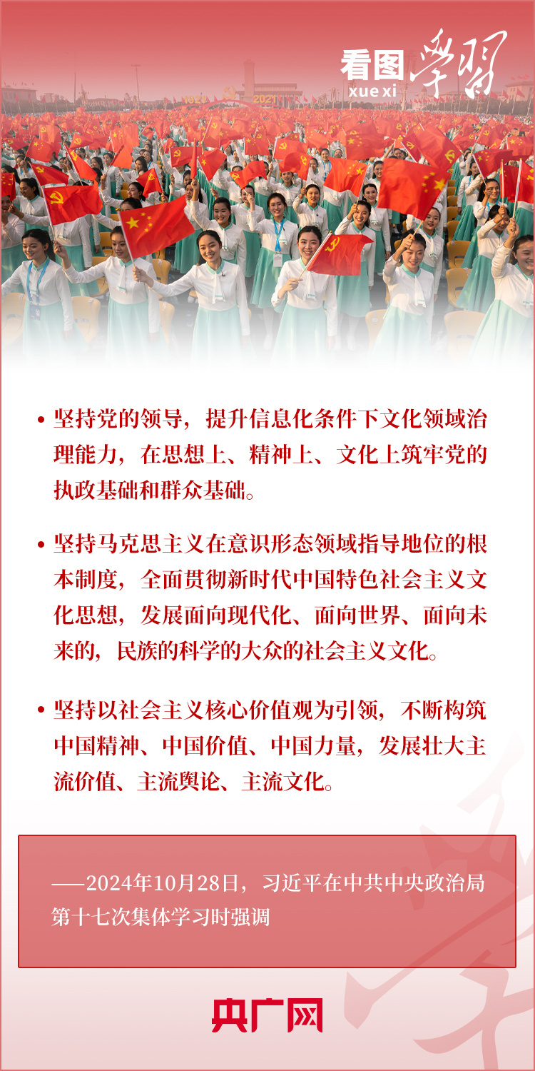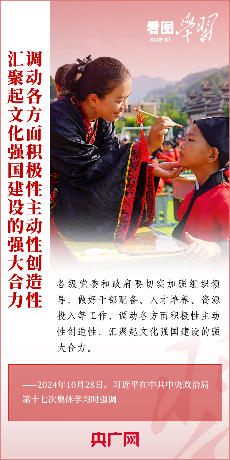 建設(shè)文化強(qiáng)國(guó)是全黨全社會(huì)的共同任務(wù)。10月28日,中共中央政治局就建設(shè)文化強(qiáng)國(guó)進(jìn)行第十七次集體學(xué)習(xí)。習(xí)近平總書(shū)記在聽(tīng)取講解和討論后發(fā)表重要講話(huà),就錨定2035年建成文化強(qiáng)國(guó)戰(zhàn)略目標(biāo)作出最新部署,強(qiáng)調(diào)要“不斷發(fā)展具有強(qiáng)大思想引領(lǐng)力、精神凝聚力、價(jià)值感召力、國(guó)際影響力的新時(shí)代中國(guó)特色社會(huì)主義文化,不斷增強(qiáng)人民精神力量,筑牢強(qiáng)國(guó)建設(shè)、民族復(fù)興的文化根基。”一起來(lái)學(xué)習(xí)!