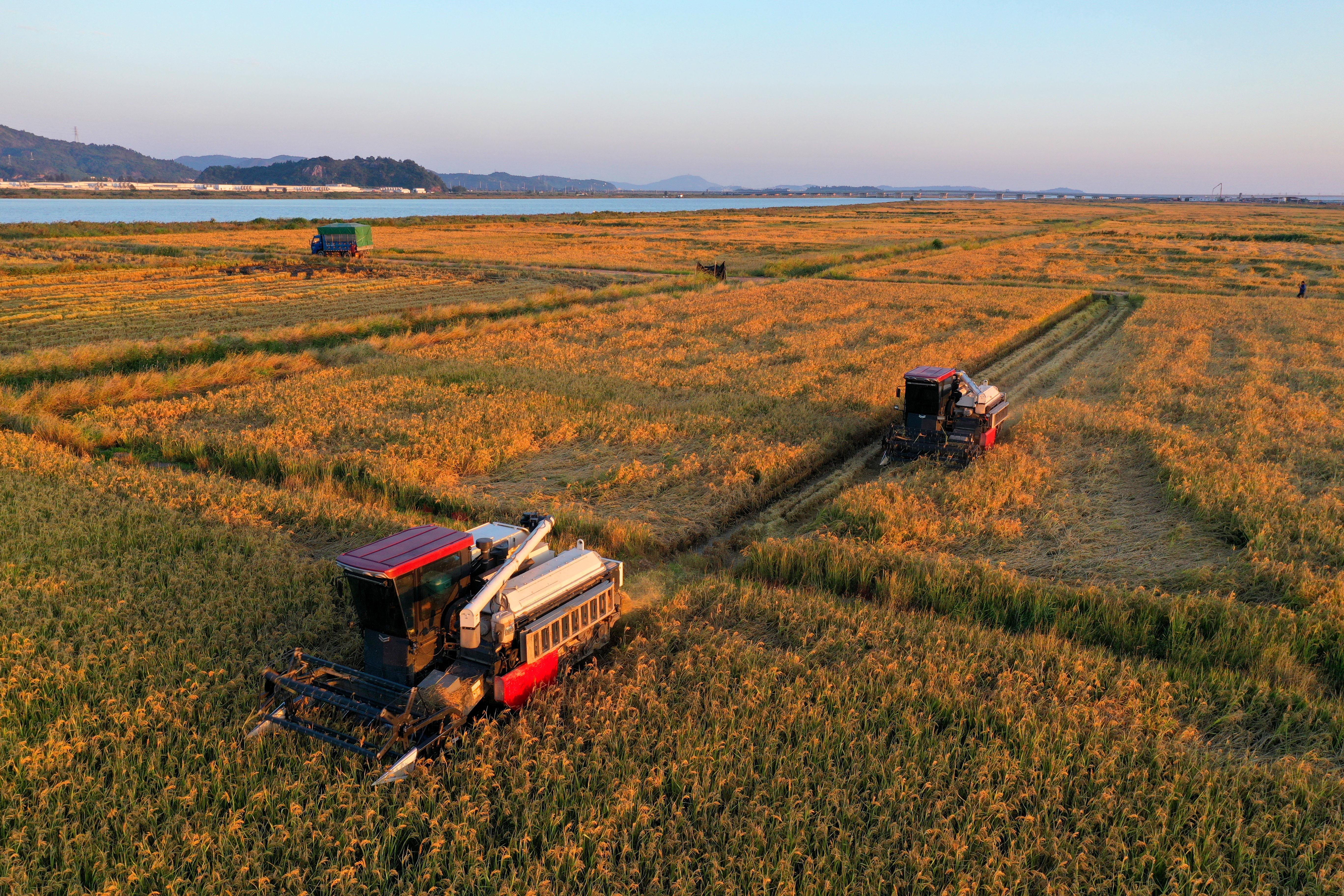 深秋時(shí)節(jié),浙江省玉環(huán)市漩門三期智慧農(nóng)業(yè)示范基地的海水稻迎來豐收,農(nóng)民駕駛收割機(jī)忙著收割。