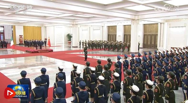 天安門(mén)廣場(chǎng)鳴放21響禮炮,禮兵列隊(duì)致敬。兩國(guó)元首登上檢閱臺(tái),軍樂(lè)團(tuán)奏中意兩國(guó)國(guó)歌。馬塔雷拉在習(xí)近平陪同下檢閱中國(guó)人民解放軍儀仗隊(duì),并觀看分列式。