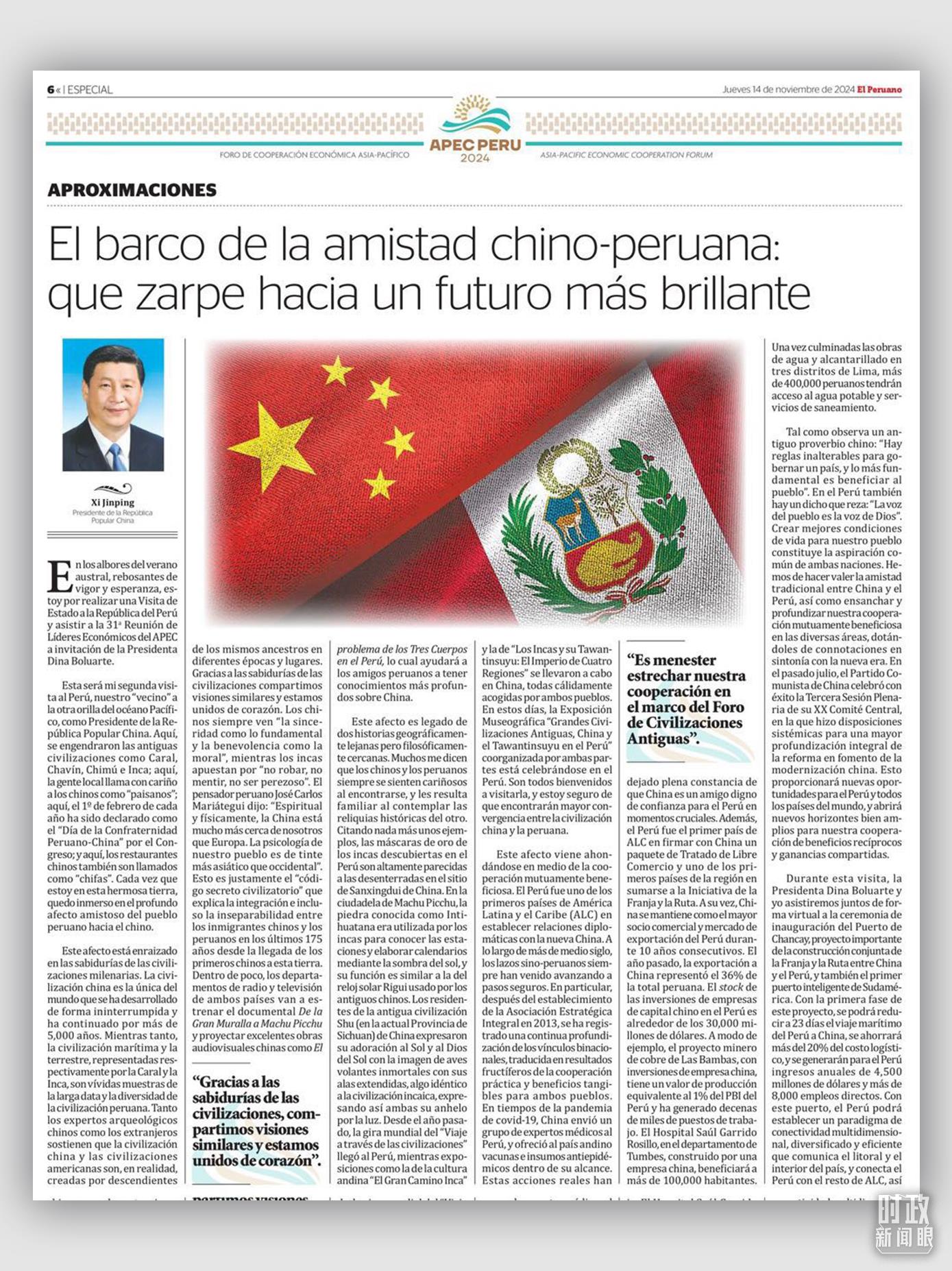 △習(xí)主席在《秘魯人報(bào)》發(fā)表題為《讓中秘友好之船揚(yáng)帆遠(yuǎn)航》的署名文章。(總臺國廣記者吳倩)