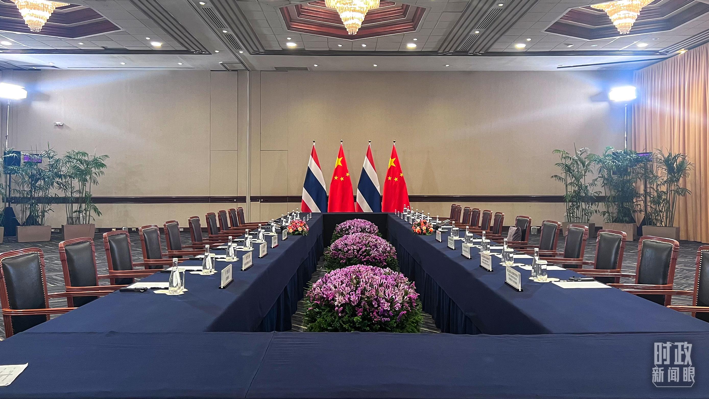 會(huì)見現(xiàn)場(chǎng)的中泰兩國(guó)國(guó)旗。(總臺(tái)央視記者范一鳴拍攝)