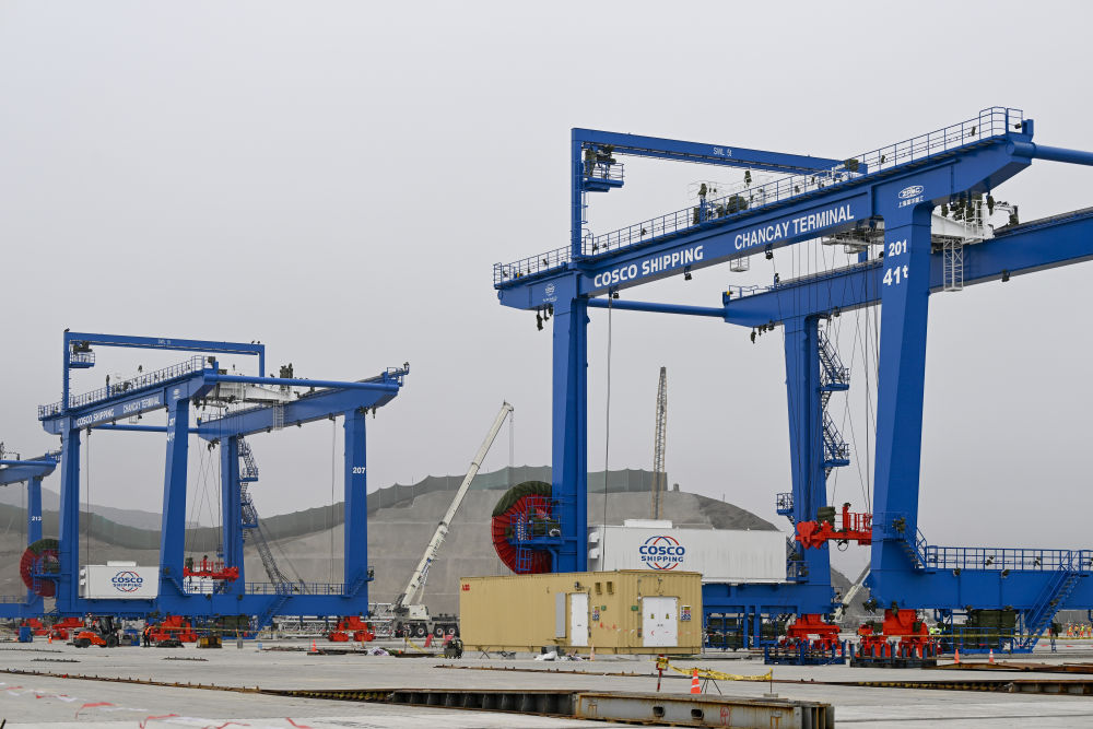 這是2024年6月21日拍攝的秘魯錢凱港碼頭操作區(qū)建設(shè)現(xiàn)場。