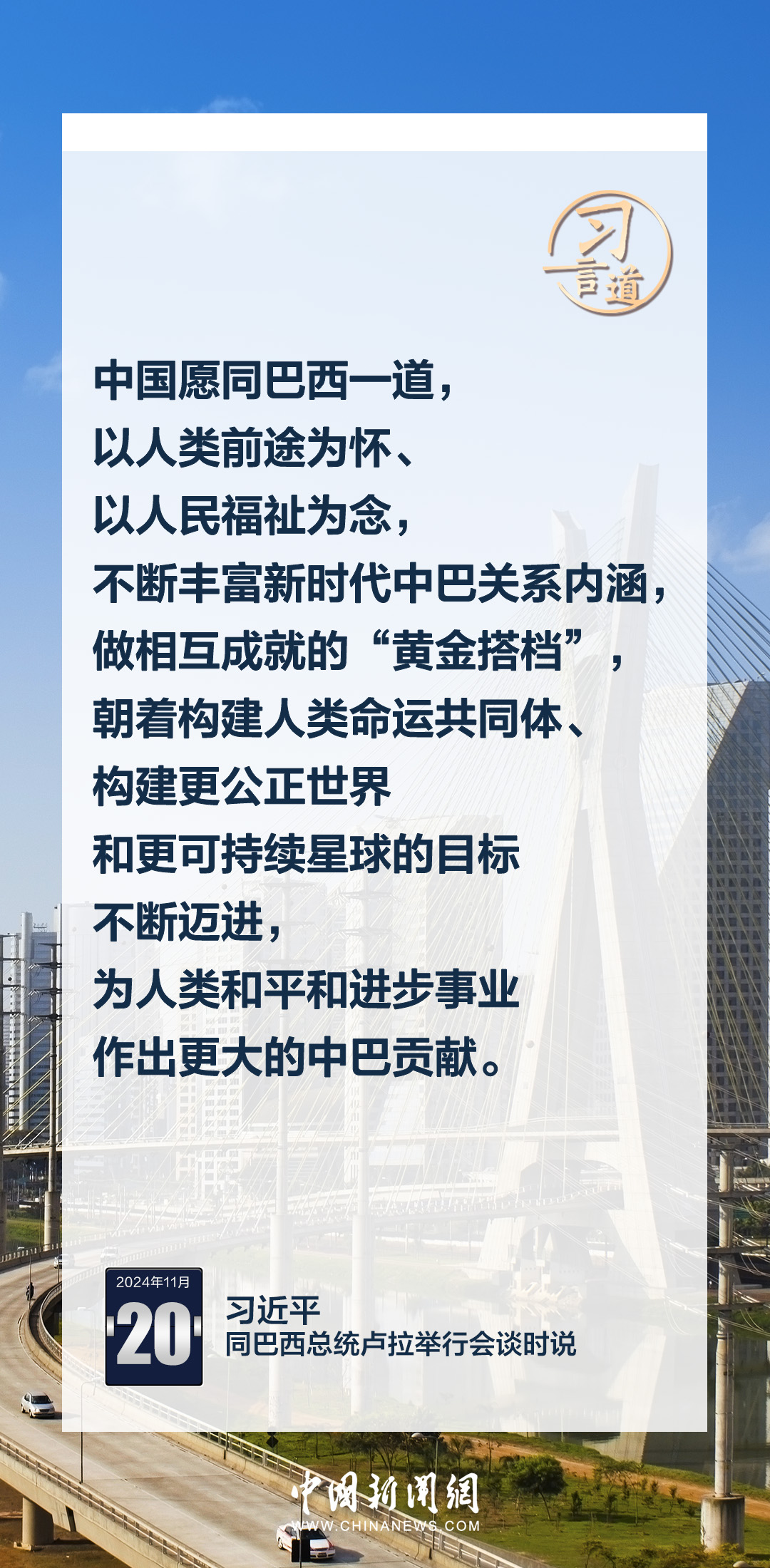 當(dāng)?shù)貢r(shí)間11月20日,中國國家主席習(xí)近平在巴西利亞總統(tǒng)官邸同巴西總統(tǒng)盧拉舉行會(huì)談。習(xí)近平指出——