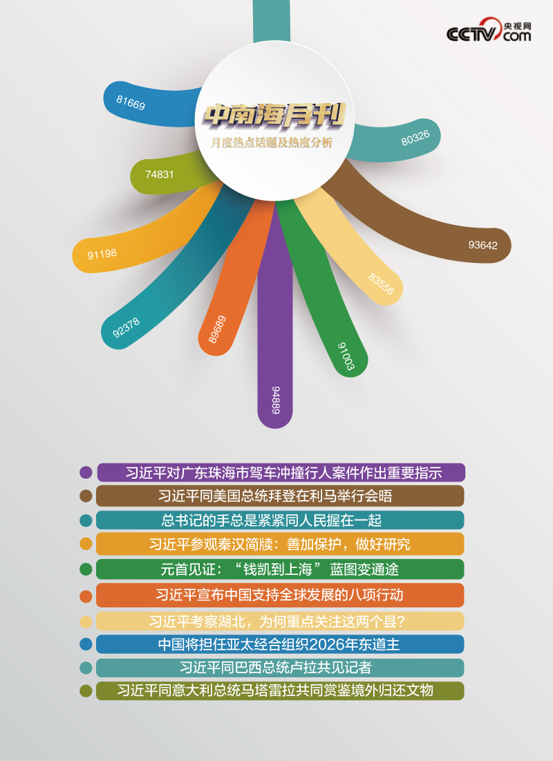 央視網(wǎng)“智聞”系統(tǒng)提取分析2024年11月全網(wǎng)時(shí)政新聞熱點(diǎn),其中總書記與人民親切互動(dòng)、世界專注傾聽中國(guó)方案等“時(shí)政微鏡頭”吸引全網(wǎng)關(guān)注。