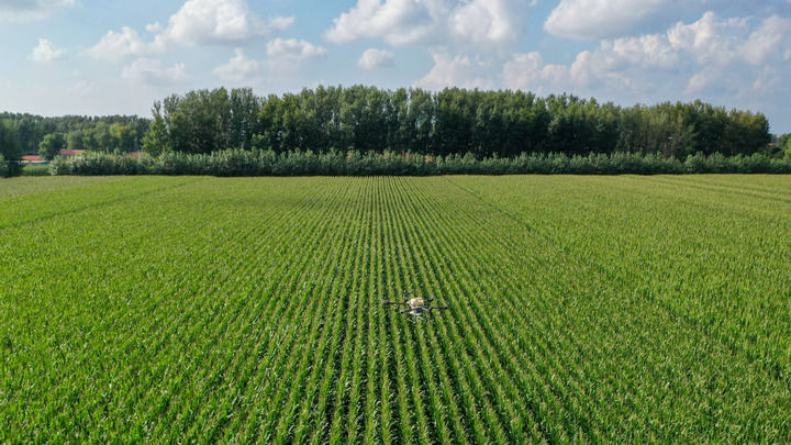 2024年8月8日,在吉林省梨樹縣孤家子鎮(zhèn),無人機(jī)為作物施肥(無人機(jī)照片)。新華社記者 張楠 攝