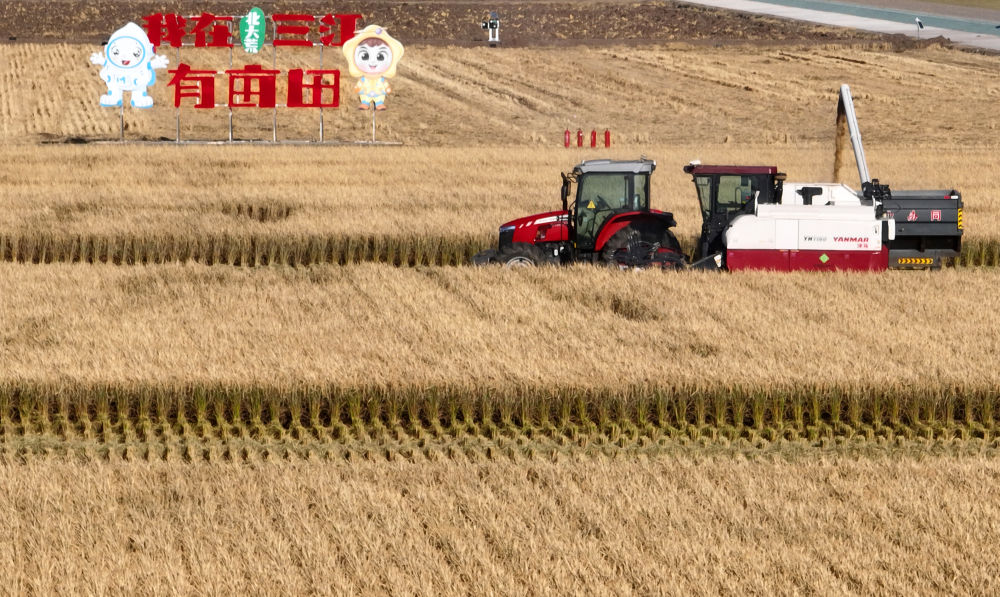 龍江大地,金風(fēng)送爽,稻浪滾滾。建三江七星農(nóng)場萬畝大地號豐收在望,10臺收割機(jī)一字排開,正在實(shí)施聯(lián)合作業(yè)。