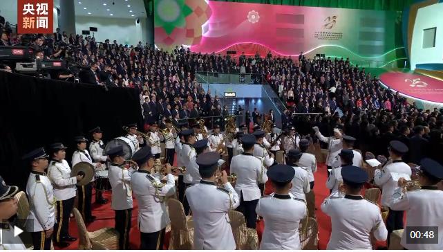 慶祝澳門回歸祖國25周年大會暨澳門特別行政區(qū)第六屆政府就職典禮20日上午在澳門東亞運(yùn)動會體育館隆重舉行,現(xiàn)場全體起立,奏唱國歌。