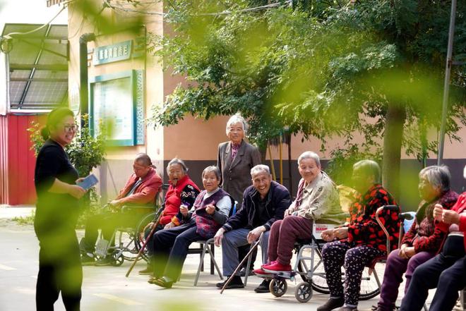 2024年10月8日,在河北巨鹿縣南大韓村菘樂(lè)醫(yī)養(yǎng)中心,工作人員陪同老人散心。