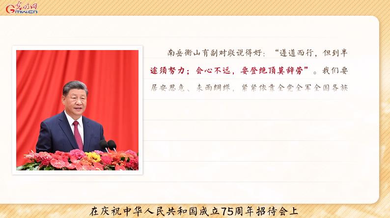 2024年是中華人民共和國成立75周年。9月30日,習(xí)近平總書記在慶祝中華人民共和國成立75周年招待會上的講話中引用南岳衡山的一副對聯(lián)“遵道而行,但到半途須努力;會心不遠,要登絕頂莫辭勞”,要求全黨同志居安思危、未雨綢繆,堅決戰(zhàn)勝一切不確定難預(yù)料的風(fēng)險挑戰(zhàn)。