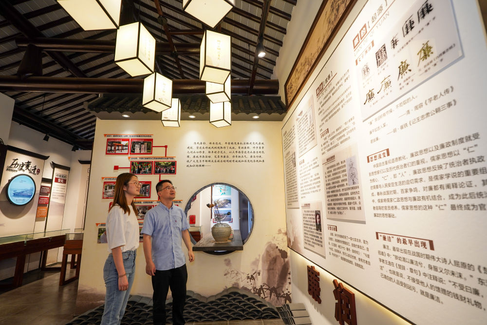 參觀者在蘇州市吳江區(qū)平望鎮(zhèn)廉潔教育基地鶯湖廉園內(nèi)參觀(2024年7月4日攝)。