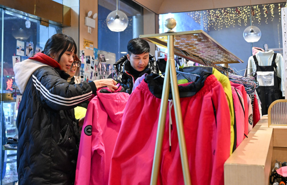 2025年1月23日,游客在湖北神農(nóng)架林區(qū)木魚鎮(zhèn)街邊一家店鋪挑選雪具雪服。自然天成的地理環(huán)境造就豐富的冰雪資源,也給當?shù)剡\動裝備銷售、租賃行業(yè)帶來了商機。