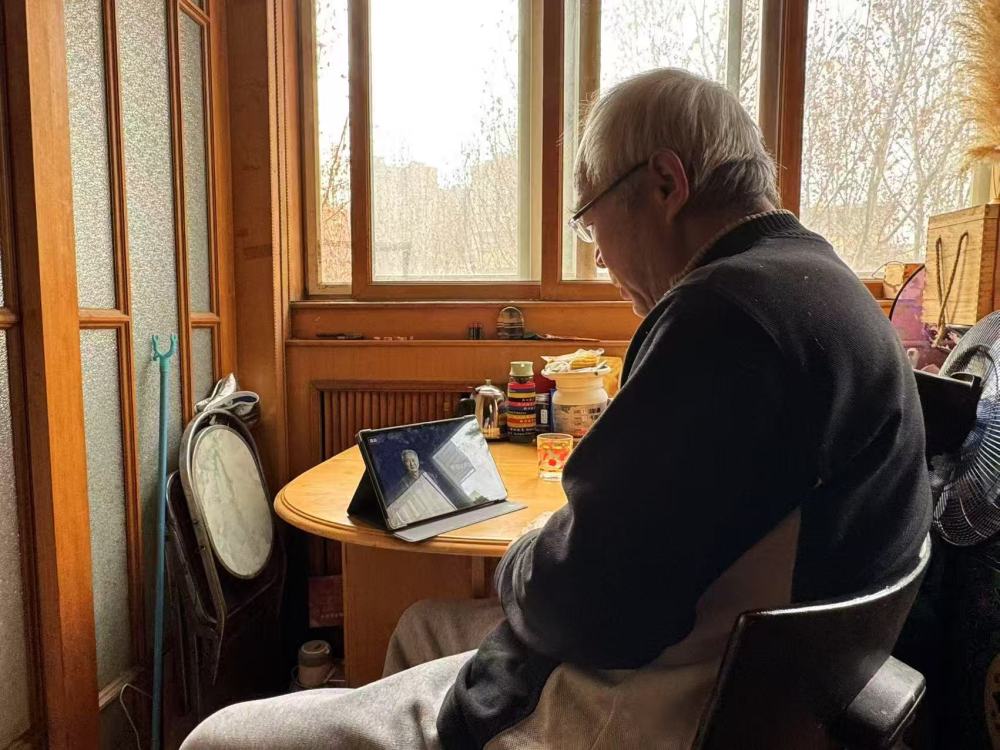 2025年1月26日,天津市南開區(qū)的老人崔金海正在同小云健康陪伴智能機(jī)中的虛擬“同伴”聊天。新華社記者 梁姊 攝