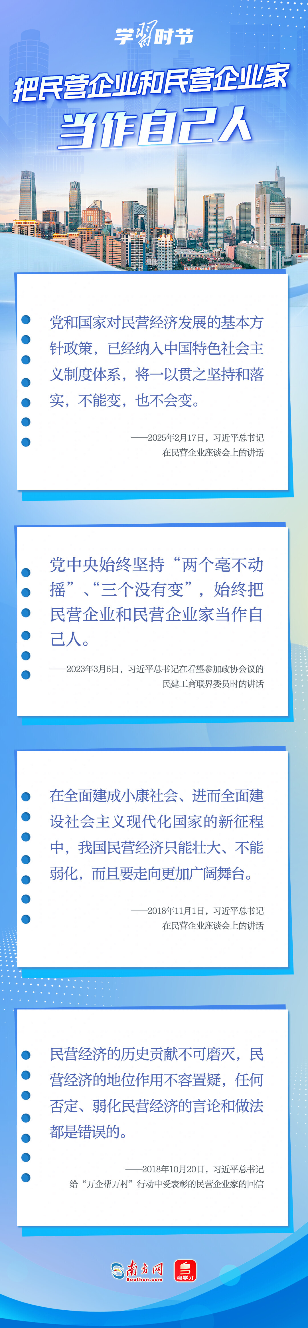 黨的十八大以來(lái),習(xí)近平總書(shū)記對(duì)民營(yíng)經(jīng)濟(jì)發(fā)展高度重視、念茲在茲,多次重申堅(jiān)持“兩個(gè)毫不動(dòng)搖”的重要方針,強(qiáng)調(diào)鼓勵(lì)、支持、引導(dǎo)非公有制經(jīng)濟(jì)繼續(xù)發(fā)展壯大,為實(shí)現(xiàn)民營(yíng)經(jīng)濟(jì)健康發(fā)展、高質(zhì)量發(fā)展注入強(qiáng)大信心和動(dòng)力。讓我們一起學(xué)習(xí)習(xí)近平總書(shū)記關(guān)于民營(yíng)經(jīng)濟(jì)的重要論述,在關(guān)鍵時(shí)刻讓民營(yíng)企業(yè)和民營(yíng)企業(yè)家堅(jiān)定發(fā)展信心,踏踏實(shí)實(shí)謀發(fā)展。