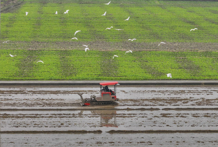 2025年2月25日,在浙江省瑞安市馬嶼鎮(zhèn)儒陽村,農(nóng)機在田間犁地,白鷺低空而飛(無人機照片)。