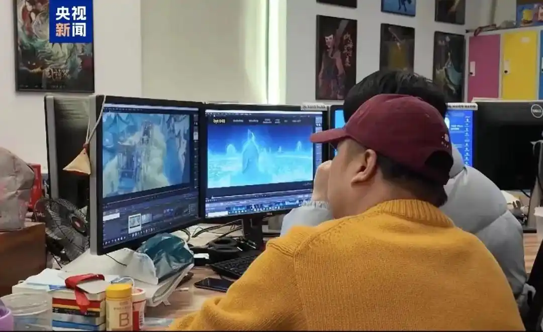 《哪吒2》壯觀的特效背后,是全國138家動畫公司的合力托舉。圖為創(chuàng)作團隊正在確認畫面效果。
