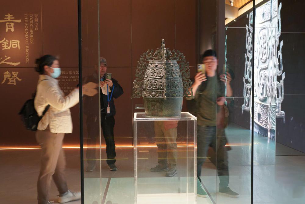 2月26日,游客在西部機場博物館珍寶館內(nèi)參觀國家一級文物“秦公镈”。