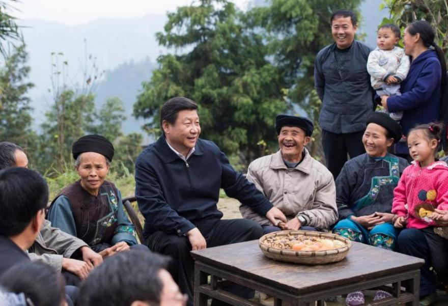 2019年4月15日,習(xí)近平在重慶市石柱土家族自治縣中益鄉(xiāng)華溪村村民、老黨員馬培清家中,同村民代表、扶貧干部圍坐院中,共話脫貧攻堅(jiān)。新華社記者 謝環(huán)馳 攝