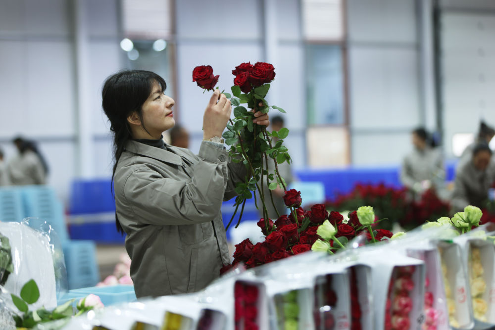 2022年11月11日,工作人員在昆明斗南花市給鮮花貼標簽。快遞物流時效不斷優(yōu)化、冷鏈運輸技術持續(xù)提升,也為中國鮮花加速“出?!北q{護航。