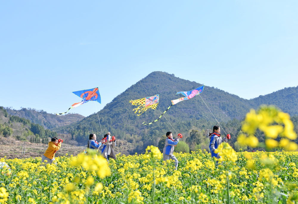 2025年3月17日,浙江省臺州市仙居縣雙廟鄉(xiāng)中心小學學生在油菜花叢中放風箏。新華社發(fā)(王華斌 攝)