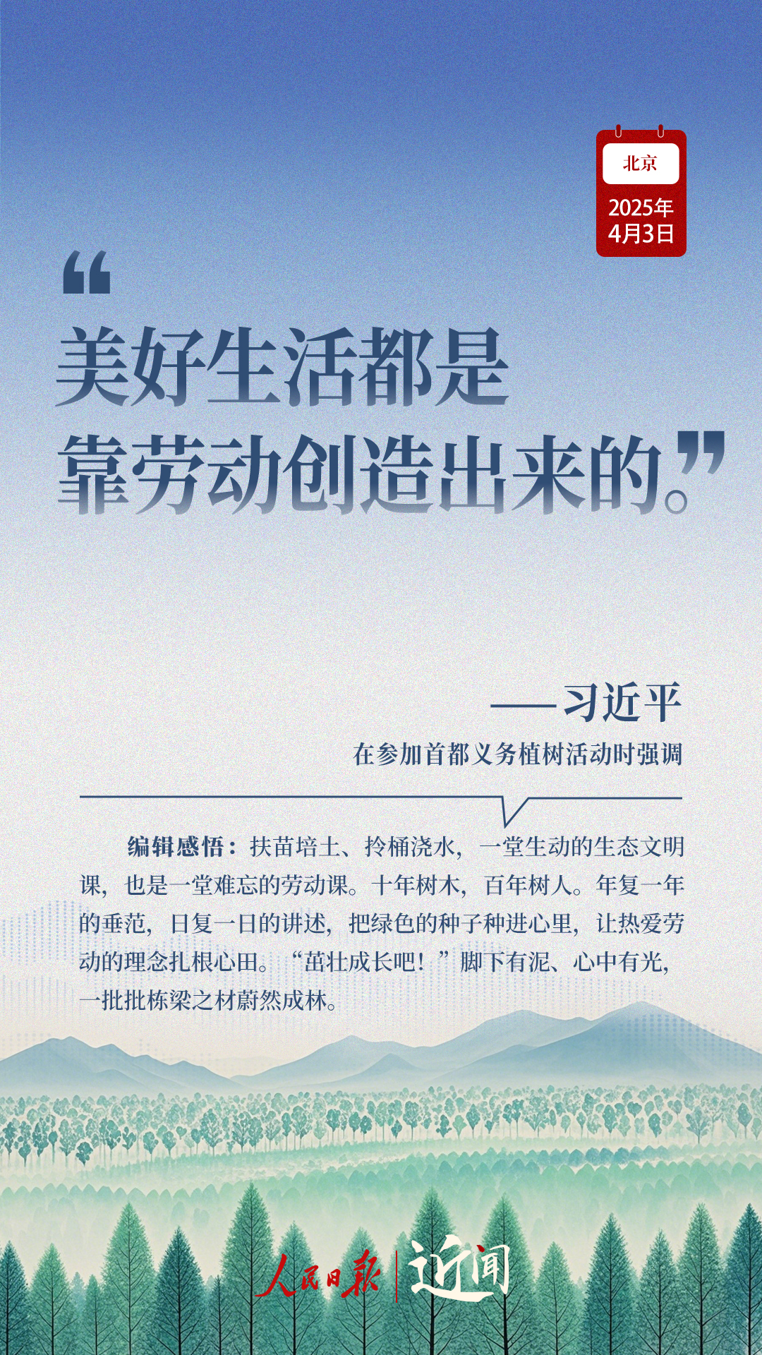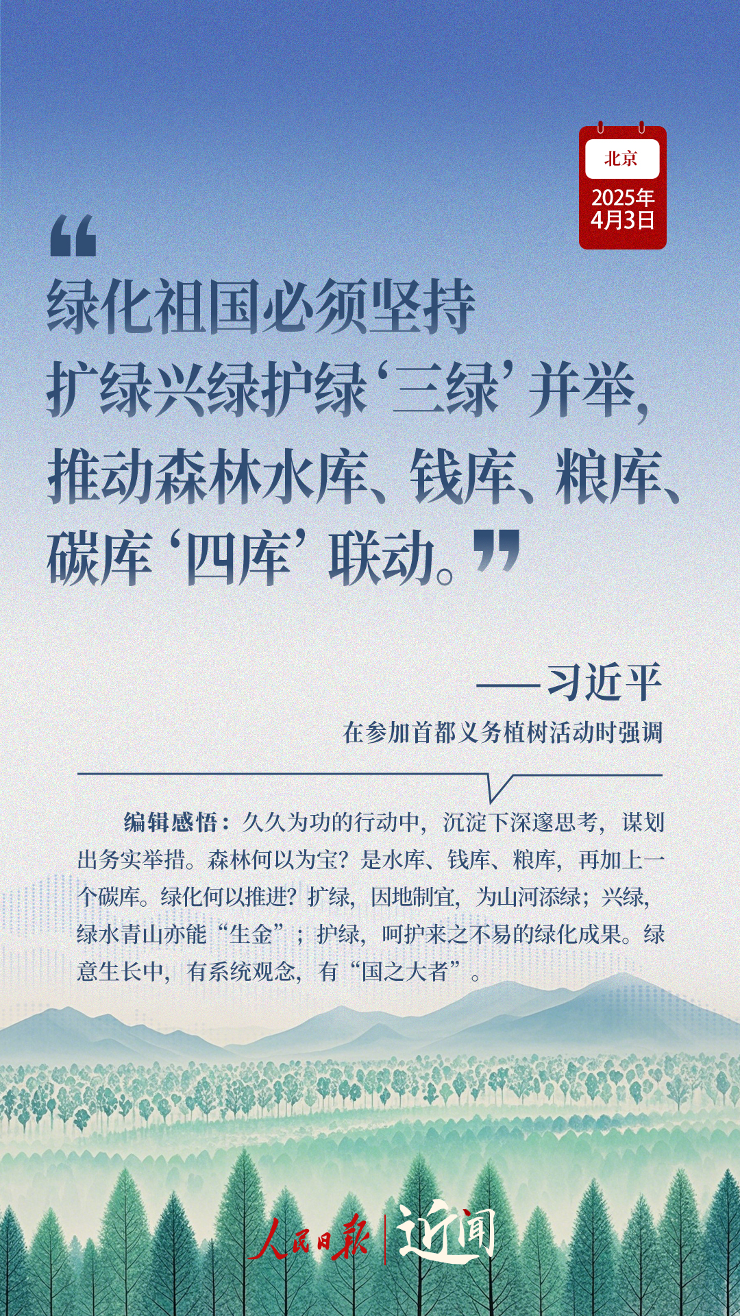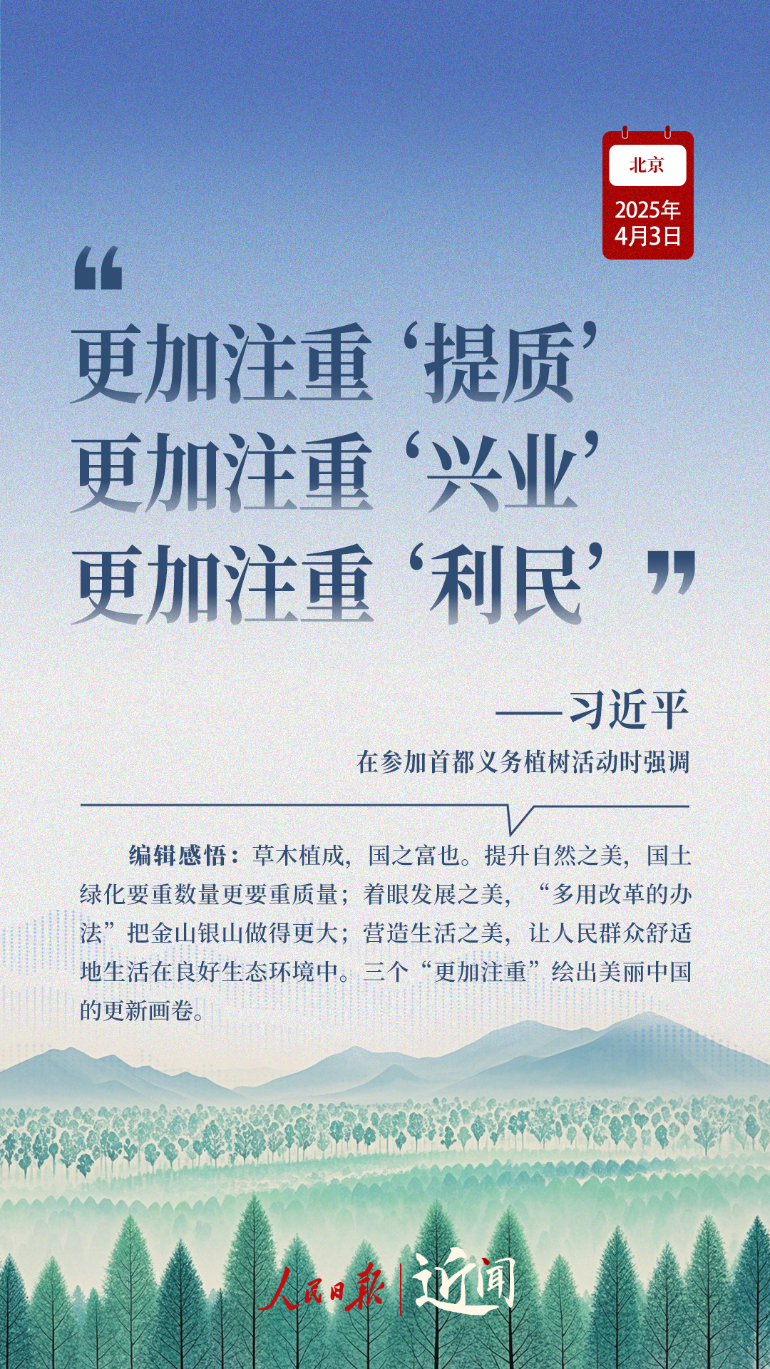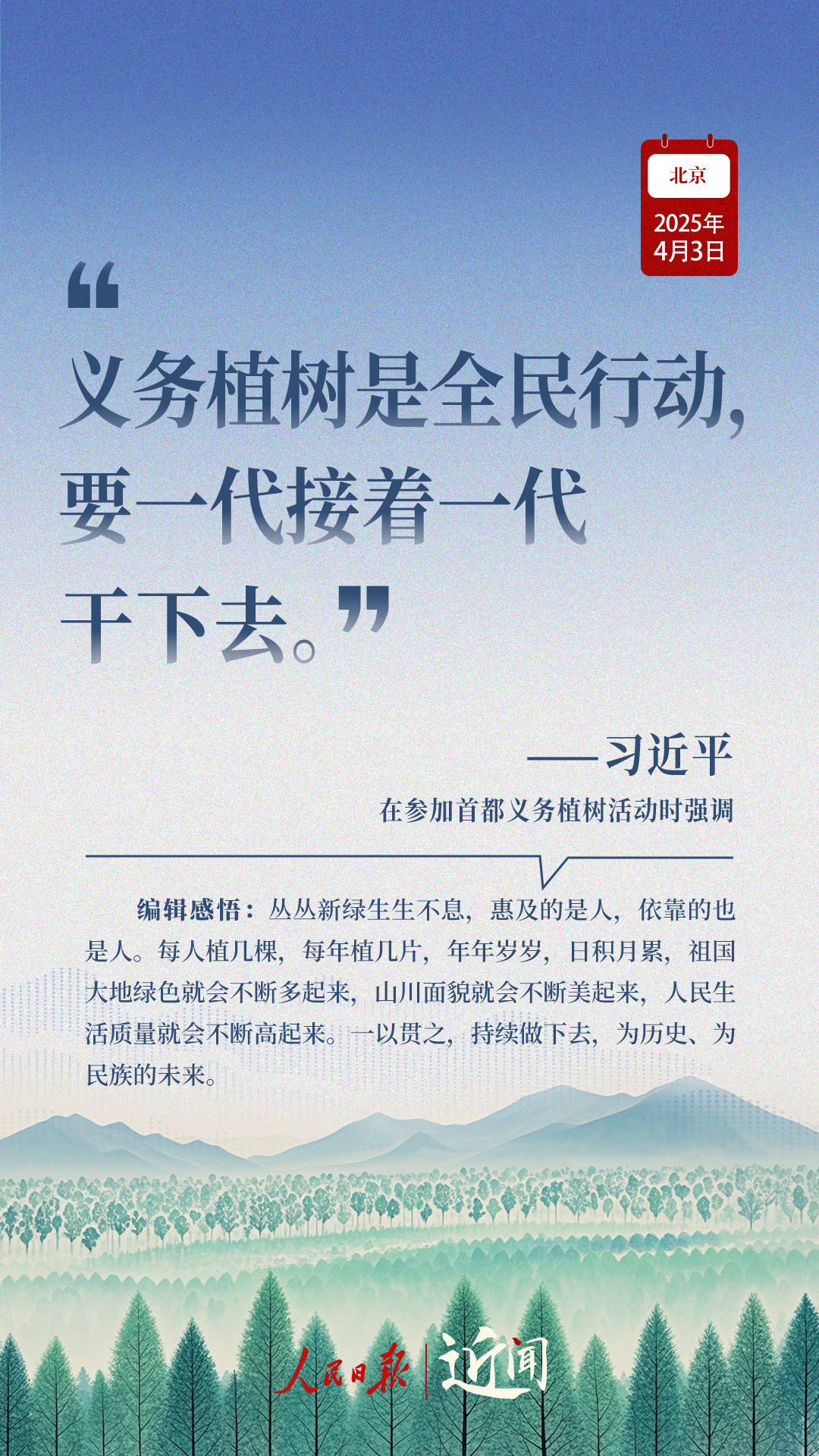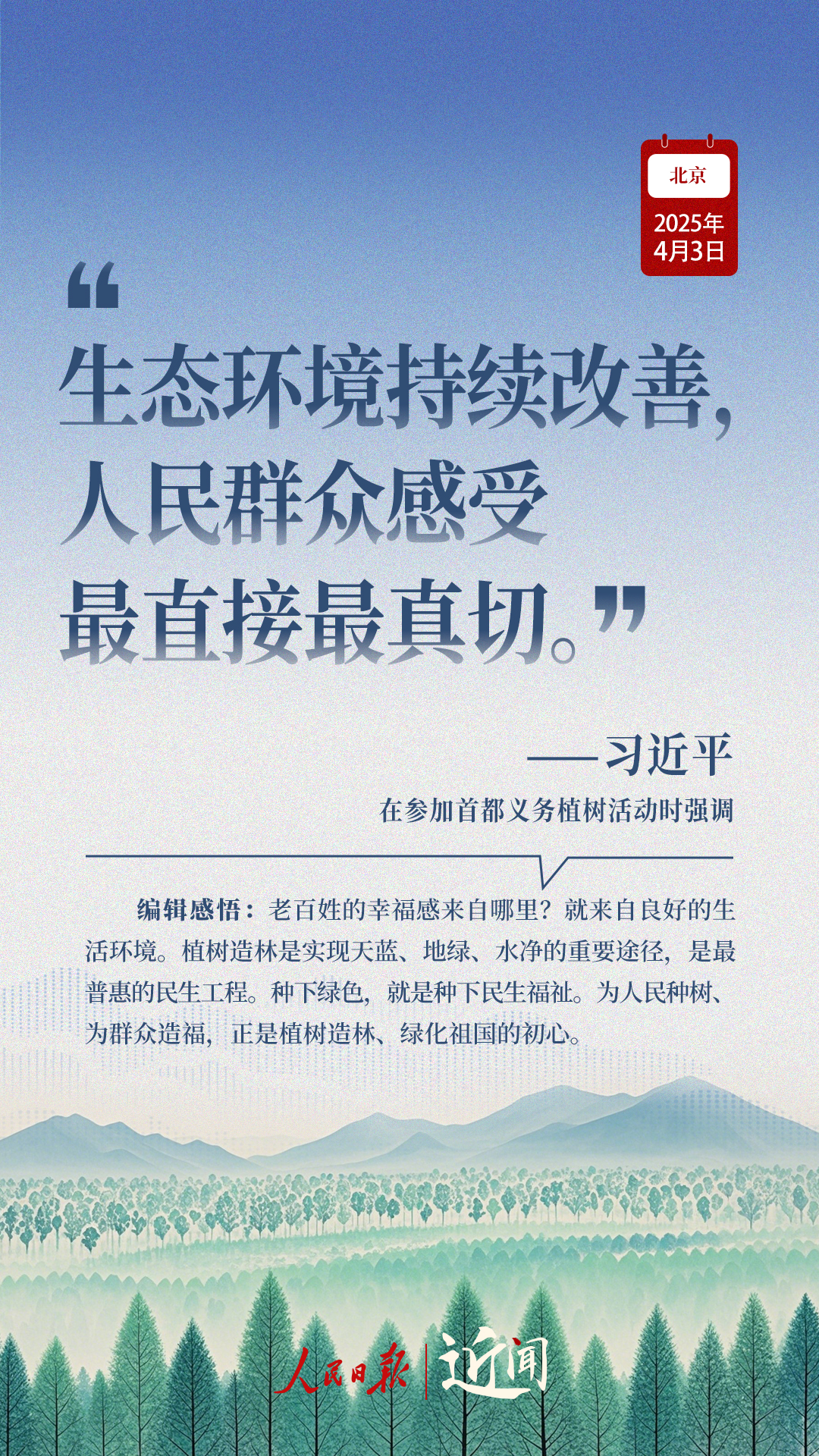 “生態(tài)環(huán)境持續(xù)改善,人民群眾感受最直接最真切。”“義務(wù)植樹(shù)是全民行動(dòng),要一代接著一代干下去。”在植樹(shù)現(xiàn)場(chǎng),從這些話語(yǔ)讀懂一份堅(jiān)持、一種情懷。