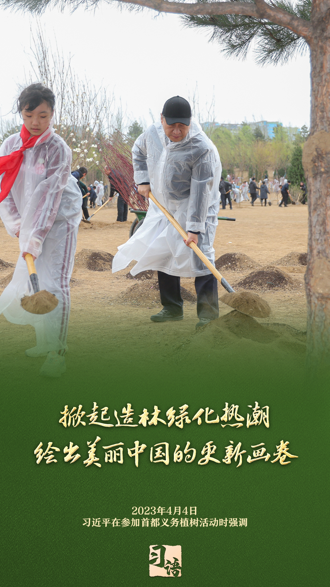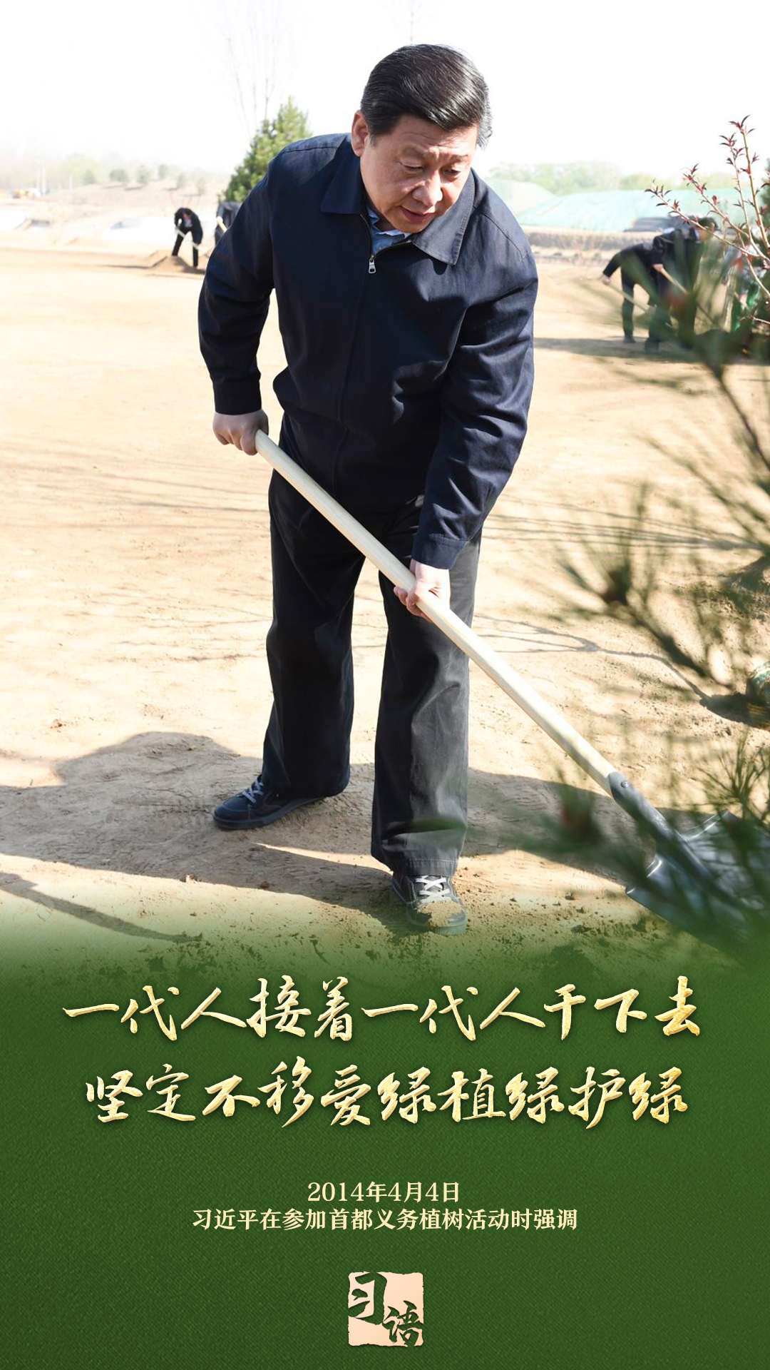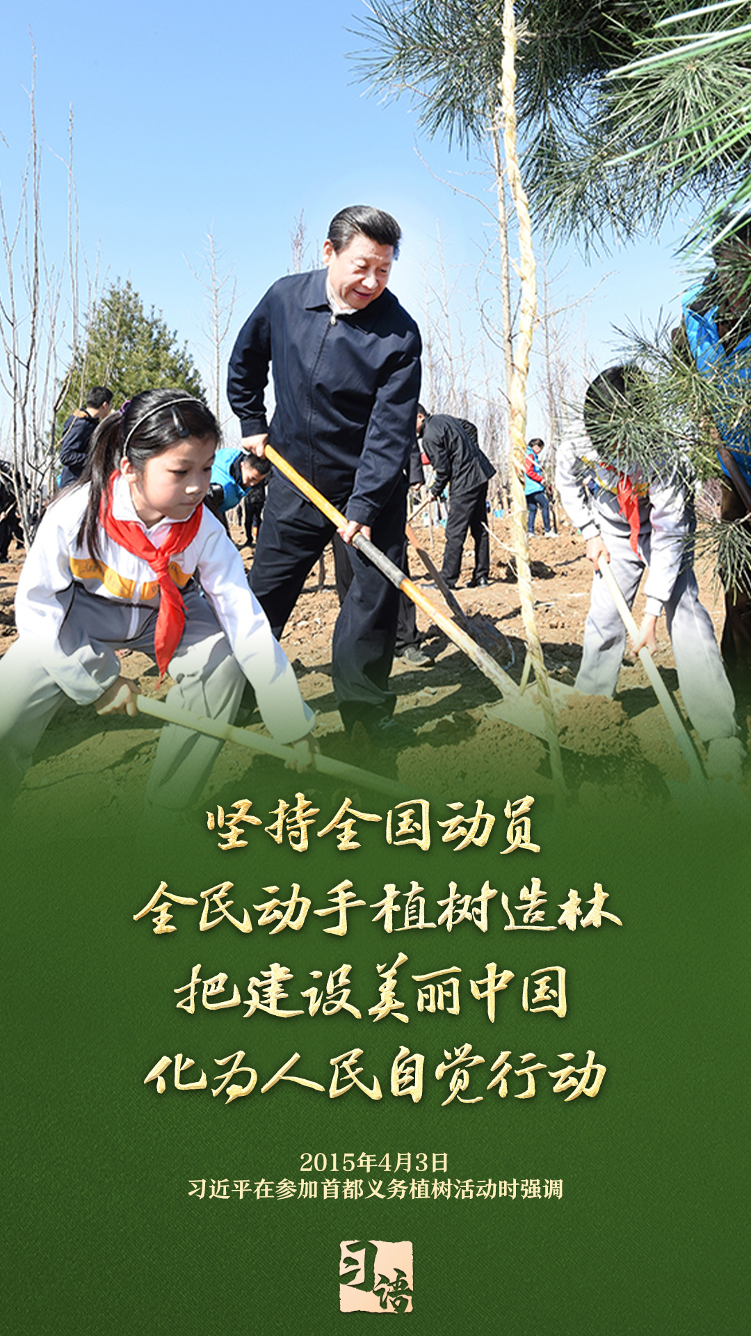 “植樹造林是一件很有意義的事情,是一項功在當代、利在千秋的崇高事業(yè),要一以貫之、持續(xù)做下去?!弊?013年以來的13個春天里,無論晴雨,習近平總書記都會拿起鐵鍬,與干部群眾一起參加首都義務植樹活動。鏟土造坑、培土圍堰、提水澆灌,總書記身體力行種下綠色的希望,對擴綠興綠護綠、建設美麗中國提出明確要求。一起學習。