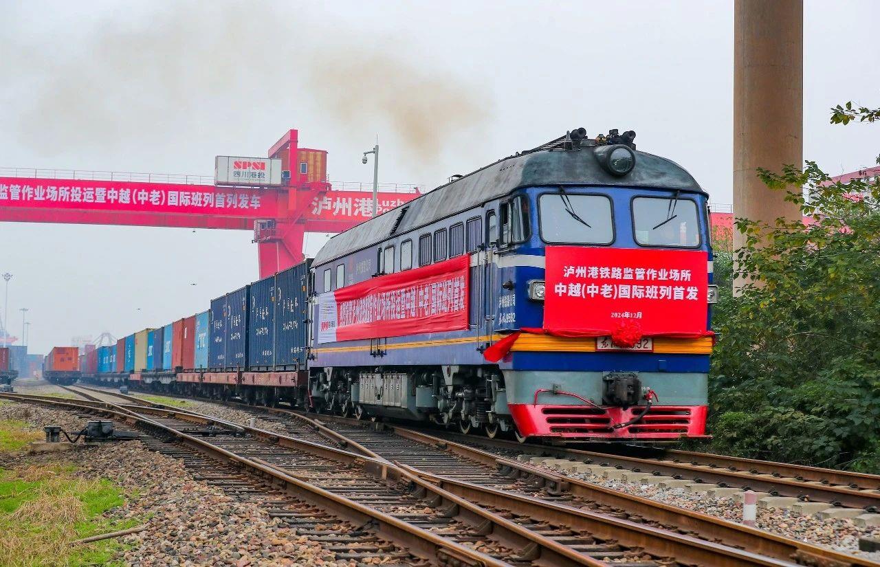 2024年12月18日,四川瀘州首列中越(中老)國(guó)際班列,從瀘州港國(guó)際集裝箱碼頭進(jìn)港鐵路專線緩緩駛出。