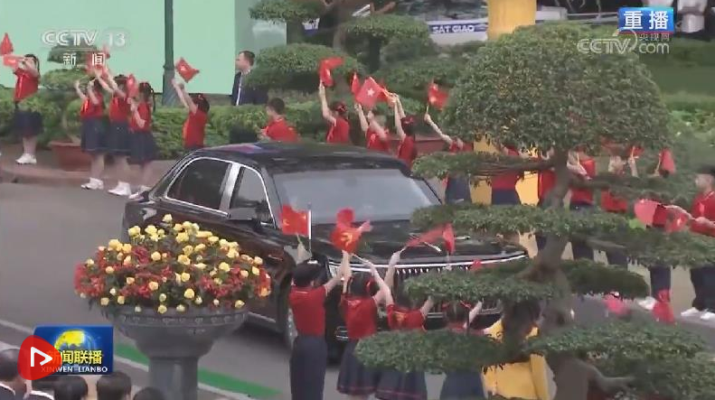 歡迎儀式后,習(xí)近平和蘇林一同步行前往越共中央駐地舉行會談。沿途數(shù)百名越南民眾揮舞兩黨兩國旗幟,對習(xí)近平表示最熱烈的歡迎。習(xí)近平向歡迎人群揮手致意。