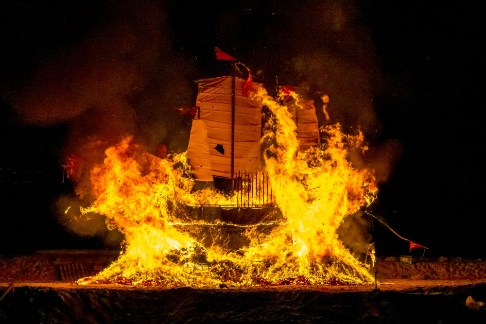 送王船是廣泛流傳于我國閩南地區(qū)和馬來西亞馬六甲沿海地區(qū)禳災祈安的民俗活動。2020年,中國與馬來西亞聯(lián)合申報的“送王船——有關人與海洋可持續(xù)聯(lián)系的儀式及相關實踐”項目,被列入聯(lián)合國教科文組織人類非物質文化遺產代表作名錄。這是2020年11月16日,在馬來西亞馬六甲,人們點燃“國安號”王船。