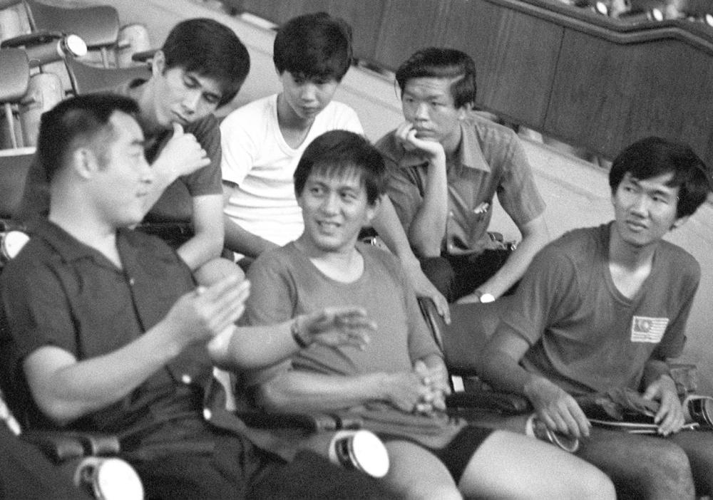1973年,中國乒乓球代表團應馬來西亞乒乓球總會的邀請,對馬來西亞進行了友好訪問,受到馬來西亞人民的熱烈歡迎。這是1973年6月11日,中國乒乓球代表團團長莊則棟(左一)同馬來西亞乒乓球運動員一起交流球技。