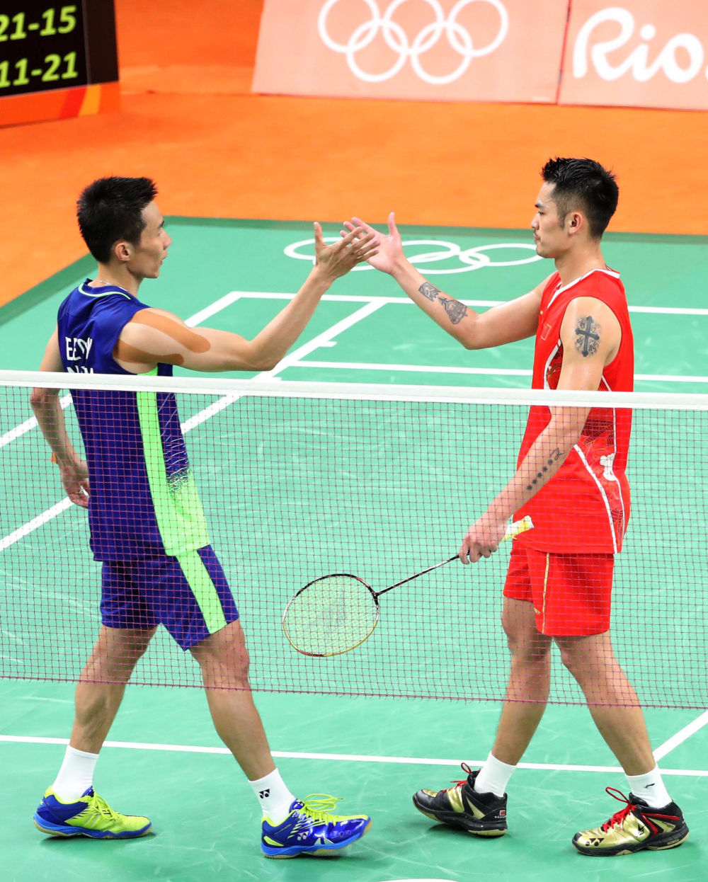 2016年8月19日,里約奧運會羽毛球男子單打半決賽后,馬來西亞選手李宗偉(左)和中國選手林丹握手致意。