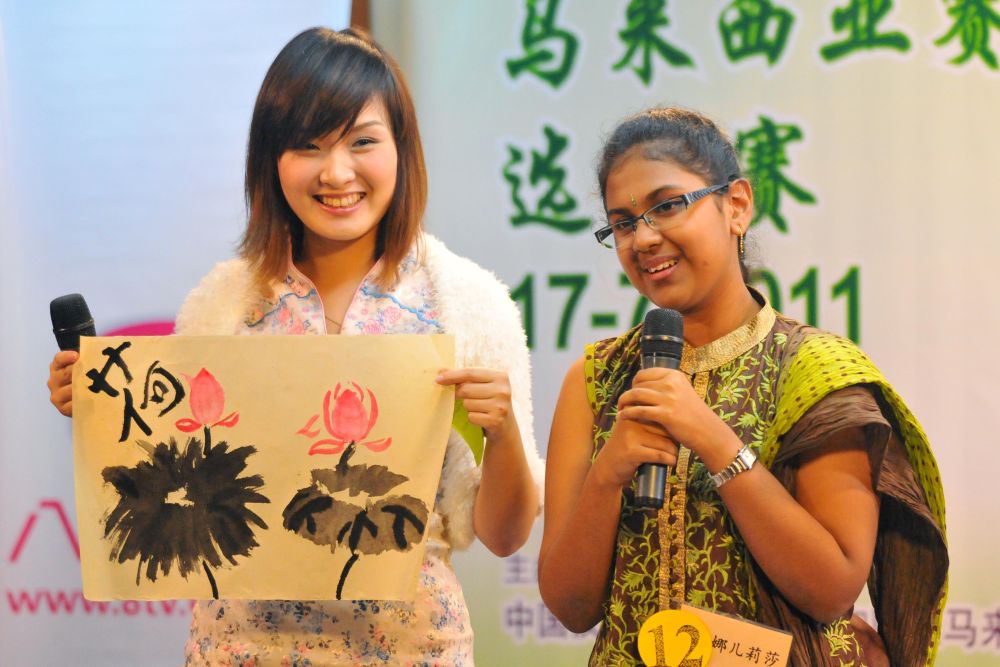 2011年7月17日,參加世界中學生中文比賽馬來西亞賽區(qū)比賽的選手馬雅司(左)展示自己創(chuàng)作的水墨畫。