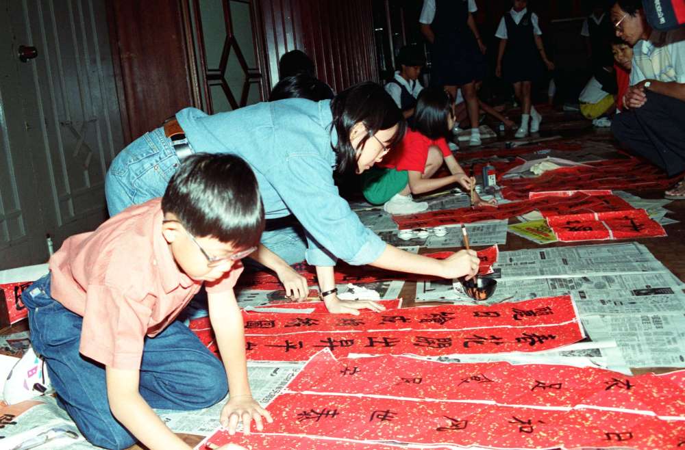 1995年,馬來西亞小書法愛好者揮筆獻技,書寫漢語條幅。
