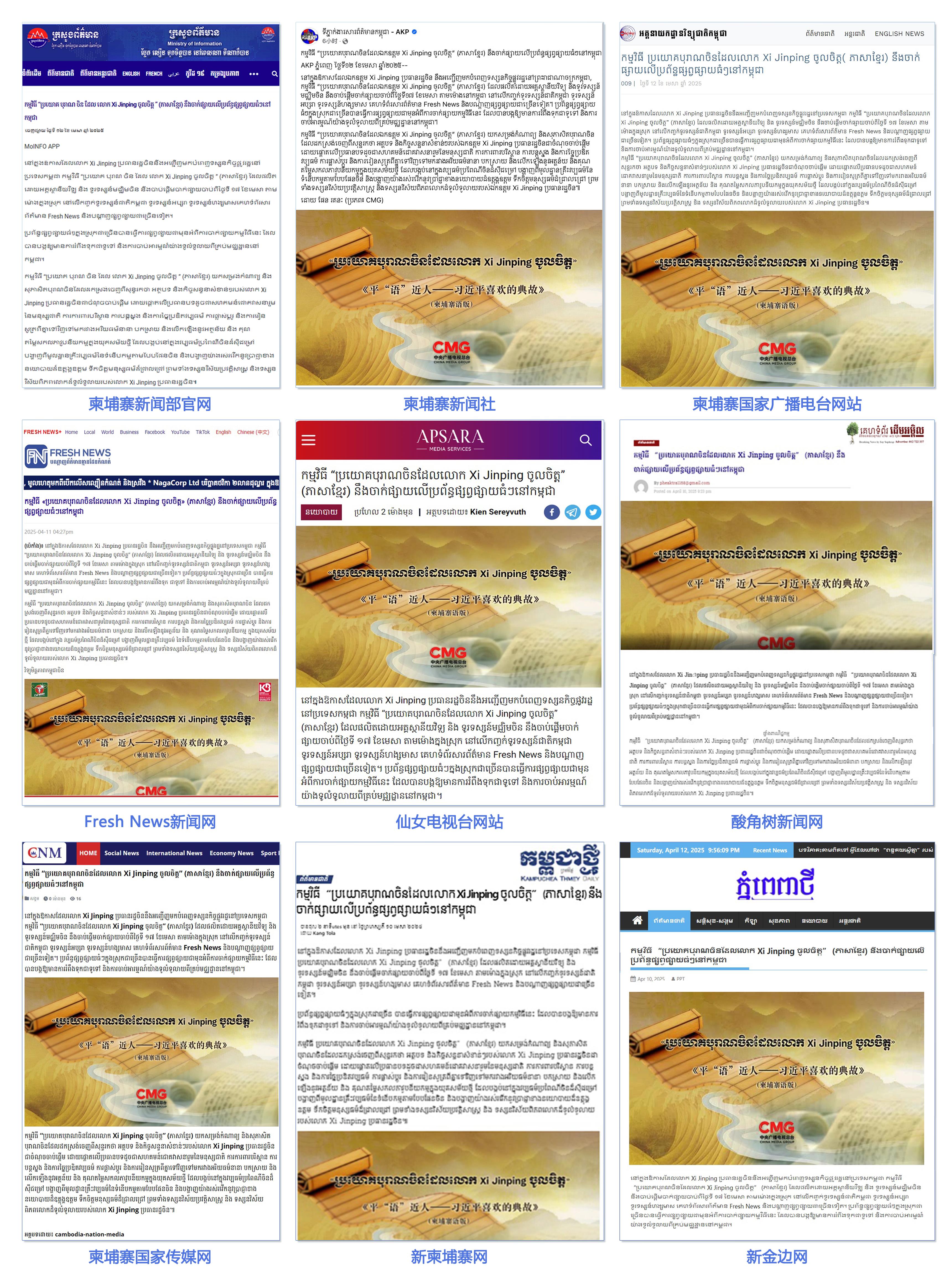 柬埔寨新聞部官網(wǎng)、柬埔寨新聞社、柬埔寨國家廣播電臺網(wǎng)站、Fresh News新聞網(wǎng)、仙女電視臺網(wǎng)站、柬中記協(xié)網(wǎng)站、酸角樹新聞網(wǎng)、柬埔寨國家傳媒網(wǎng)、新柬埔寨網(wǎng)、新金邊網(wǎng)、《金邊日報》網(wǎng)等柬主流媒體發(fā)布相關(guān)報道。