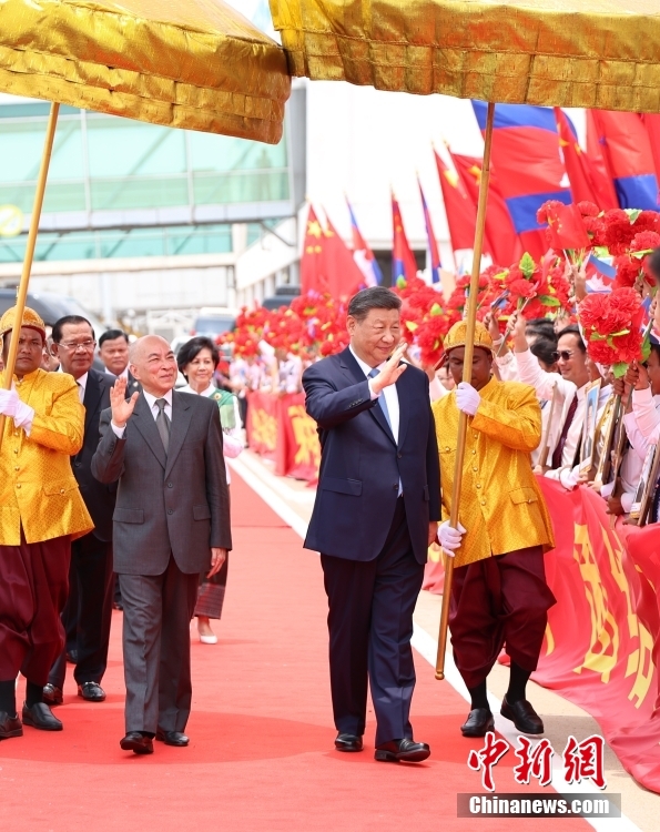 當(dāng)?shù)貢r間4月17日上午,中國國家主席習(xí)近平乘專機抵達金邊,應(yīng)柬埔寨國王西哈莫尼邀請,對柬埔寨進行國事訪問。西哈莫尼在機場為習(xí)近平舉行隆重歡迎儀式。 中新社記者 盛佳鵬 攝