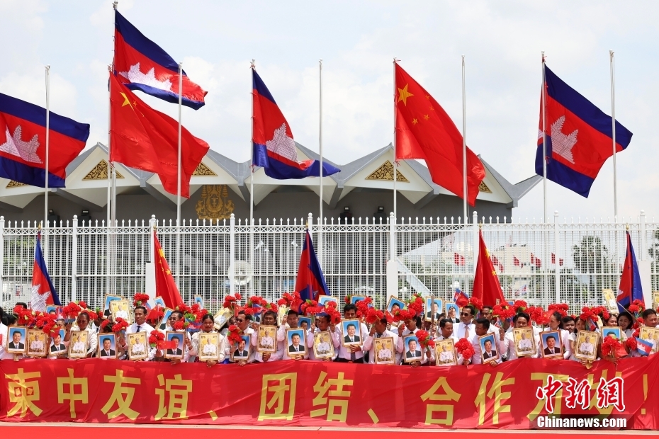 習(xí)近平抵達(dá)柬埔寨時,在停機坪現(xiàn)場,禮兵分列紅毯兩側(cè),軍樂團奏起中柬兩國國歌,數(shù)百名當(dāng)?shù)孛癖姄]舞中柬國旗,歡迎鐵桿朋友再次到訪。